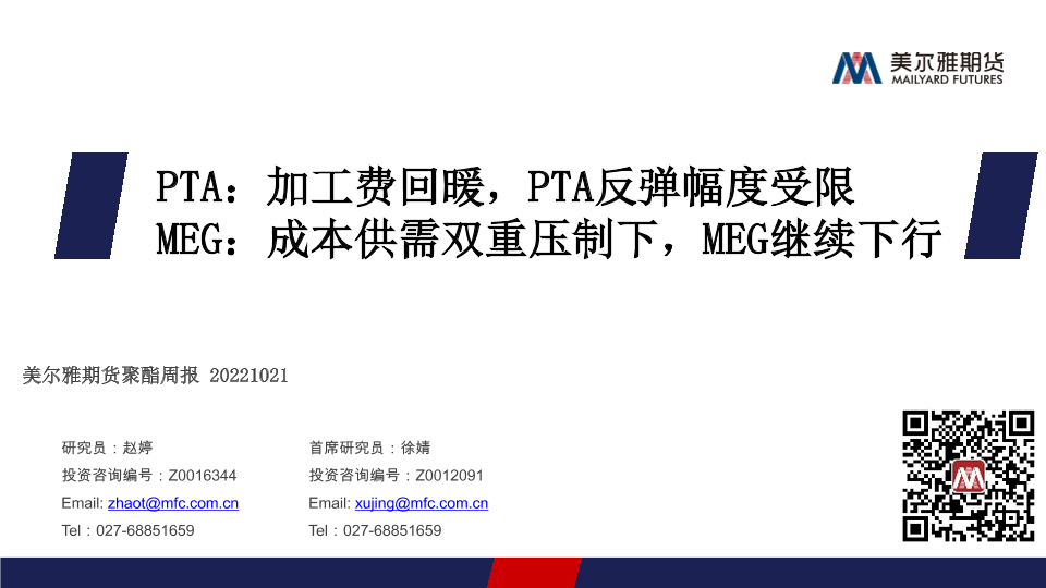 【美尔雅期货】【20221021】聚酯周报:PTA,加工费回暖,PTA反弹幅度受限,MEG,成本供需双重压制下,MEG继续下行-23页