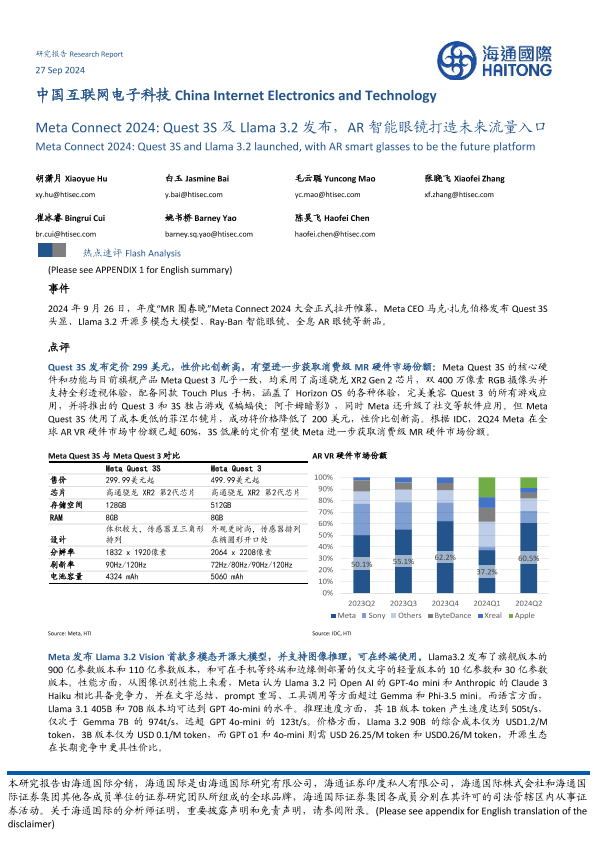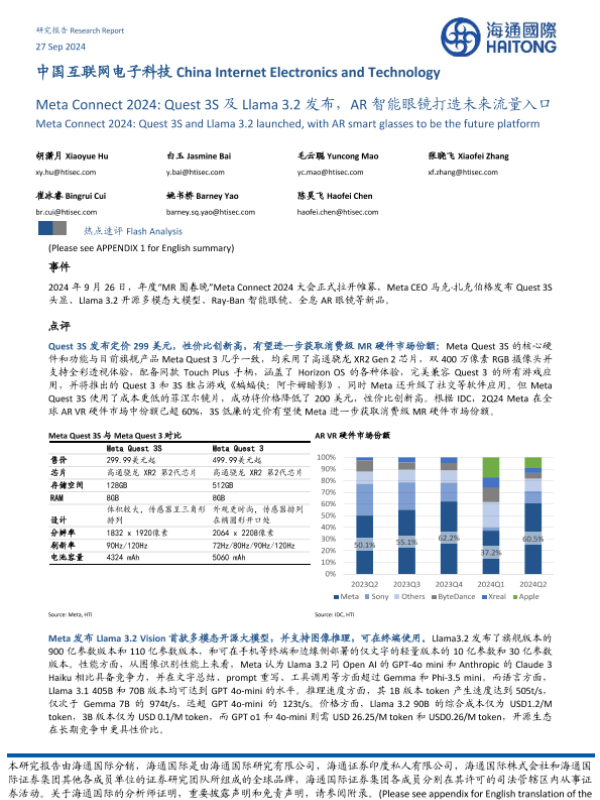 【海通国际】【20240927】电子科技行业:Meta Connect 2024,Quest 3S及Llama 3.2发布,AR智能眼镜打造未来流量入口-10页