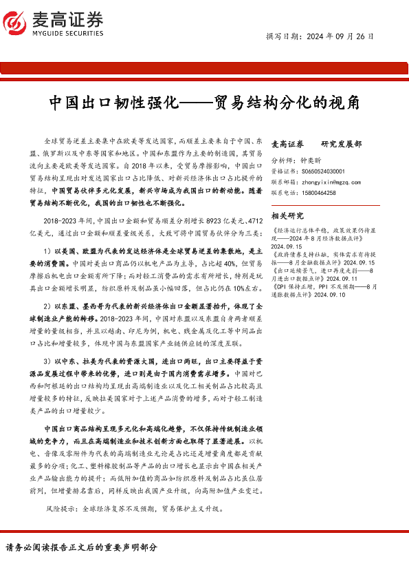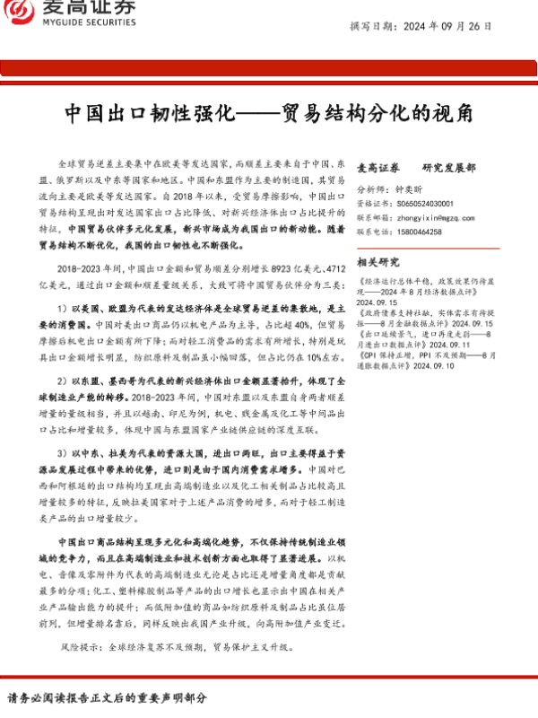 【麦高证券】【20240926】中国出口韧性强化——贸易结构分化的视角-20页