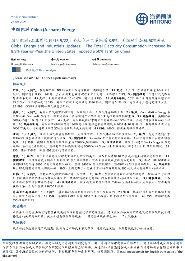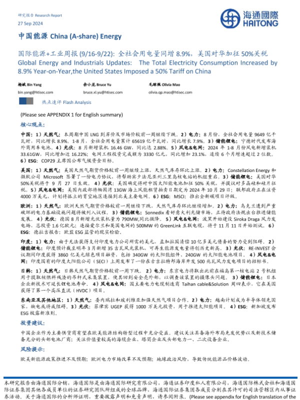 【海通国际】【20240927】中国能源行业:国际能源+工业周报(9/16-9/22) 全社会用电量同增8.9%,美国对华加征50%关税-39页