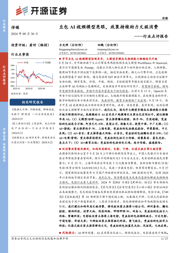 【开源证券】【20240930】传媒行业点评报告:豆包AI视频模型亮眼,政策持续助力文娱消费-17页