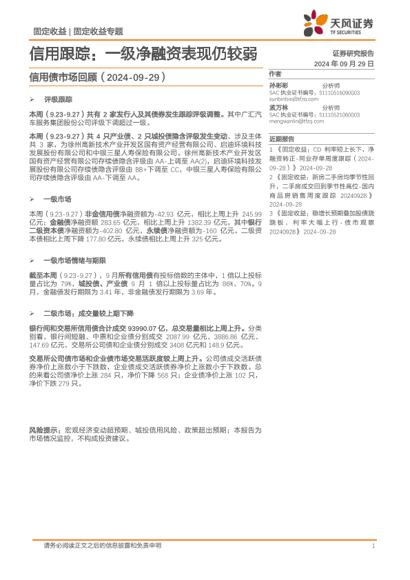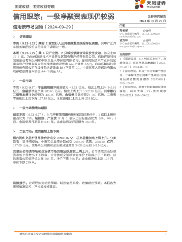 【天风证券】【20240929】信用债市场回顾:信用跟踪,一级净融资表现仍较弱-18页