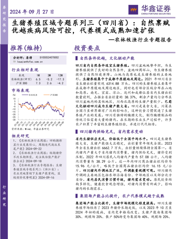 【华鑫证券】【20240927】农林牧渔行业专题报告:生猪养殖区域专题系列三(四川省),自然禀赋优越疾病风险可控,代养模式成熟加速扩张-11页