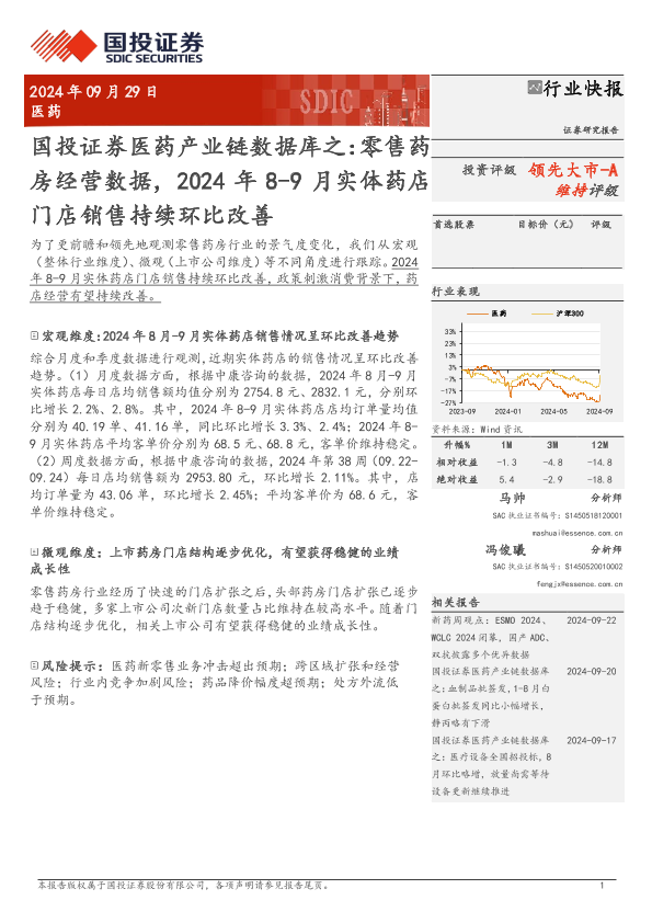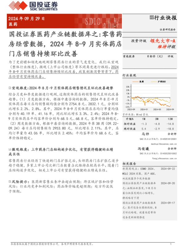 【国投证券】【20240929】医药行业医药产业链数据库之:零售药房经营数据,2024年8-9月实体药店门店销售持续环比改善-11页