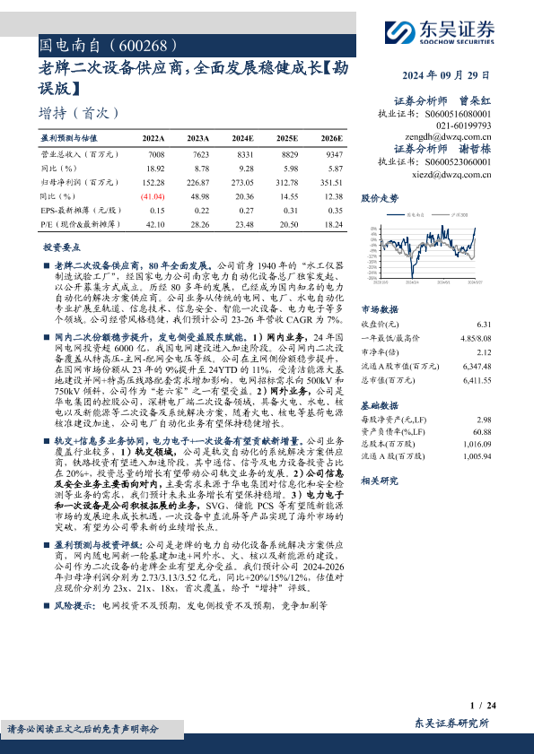 【东吴证券】【20240929】国电南自(600268)老牌二次设备供应商,全面发展稳健成长【勘误版】-24页