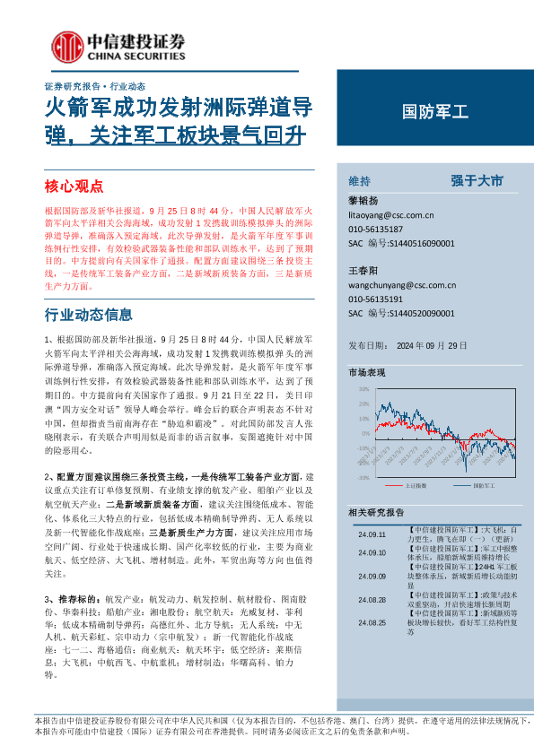 【中信建投证券】【20240929】国防军工行业:火箭军成功发射洲际弹道导弹,关注军工板块景气回升-26页