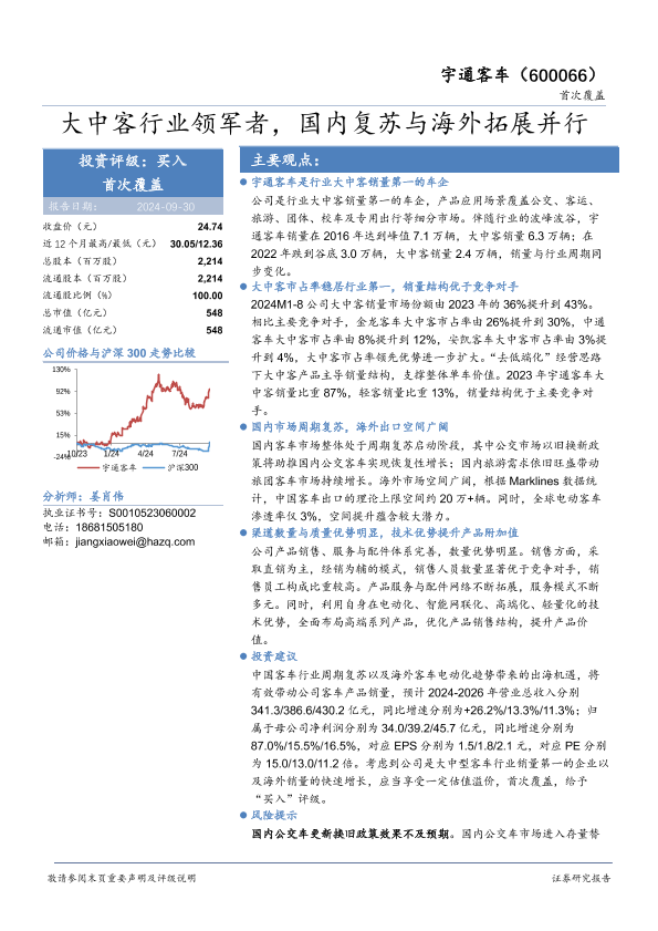 【华安证券】【20240930】宇通客车(600066)大中客行业领军者,国内复苏与海外拓展并行-27页