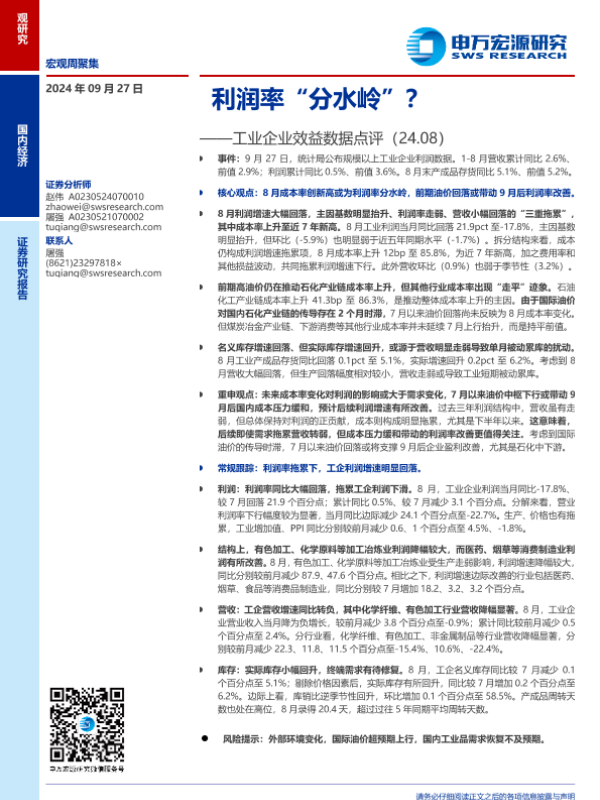 【申万宏源】【20240927】工业企业效益数据点评(24.08):利润率“分水岭”?-10页