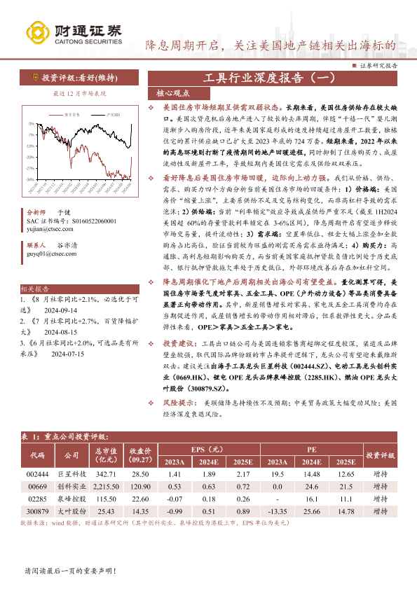 出海标的 工具行业 投资评级 美国地产 降息周期