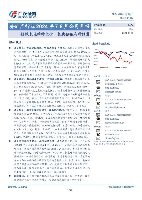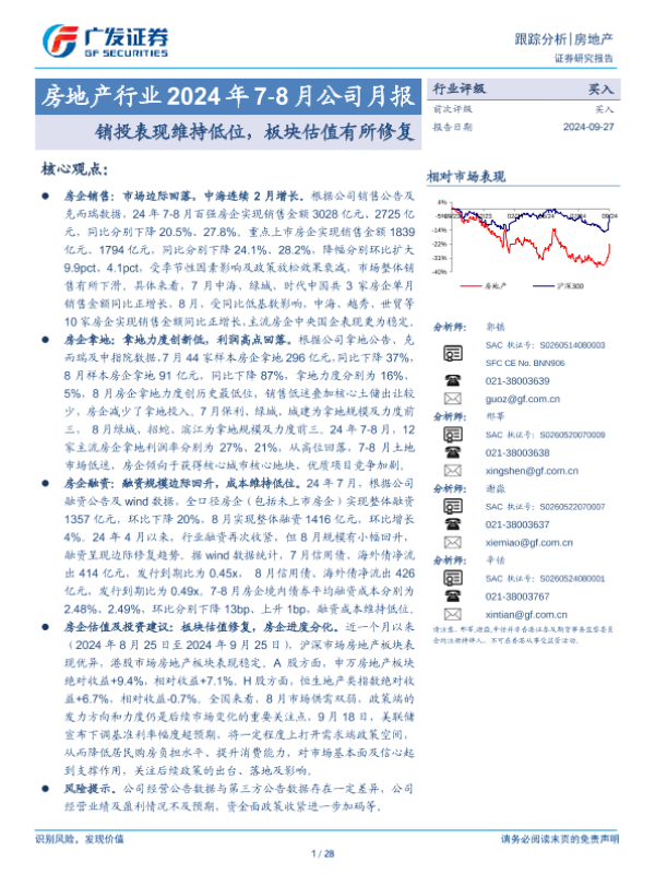 【广发证券】【20240927】房地产行业2024年7-8月公司月报:销投表现维持低位,板块估值有所修复-28页
