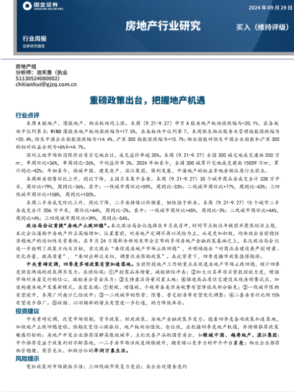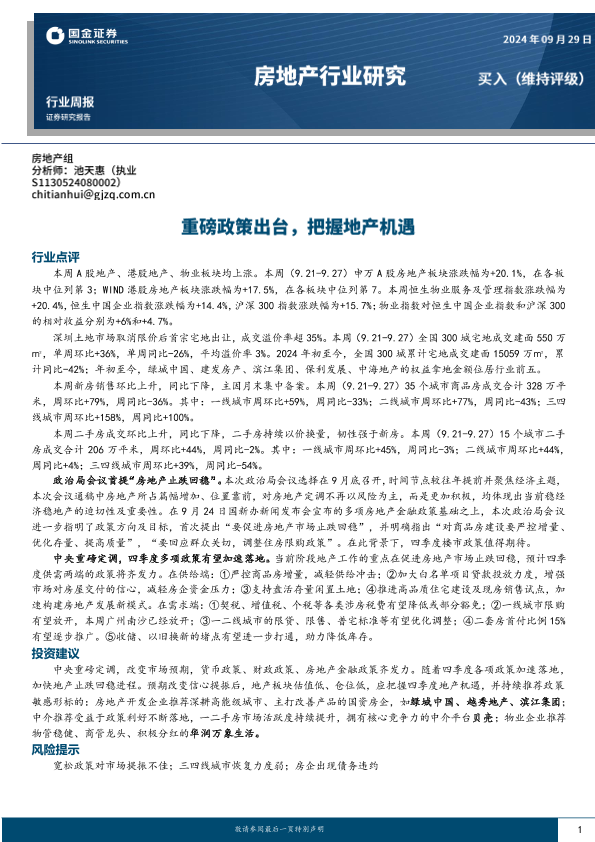 【国金证券】【20240929】房地产行业研究:重磅政策出台,把握地产机遇-17页