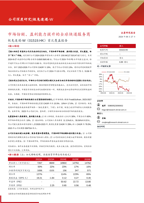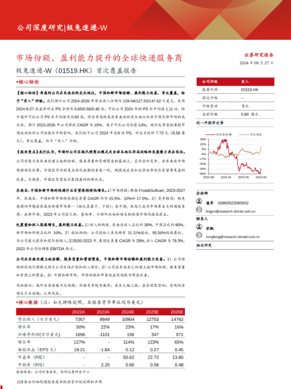 【西部证券】【20240927】极兔速递-W(1519.HK)首次覆盖报告:市场份额、盈利能力提升的全球快递服务商-33页