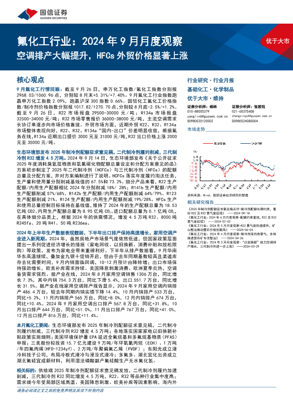 【国信证券】【20240927】氟化工行业2024年9月月度观察:空调排产大幅提升,HFCs外贸价格显著上涨-34页