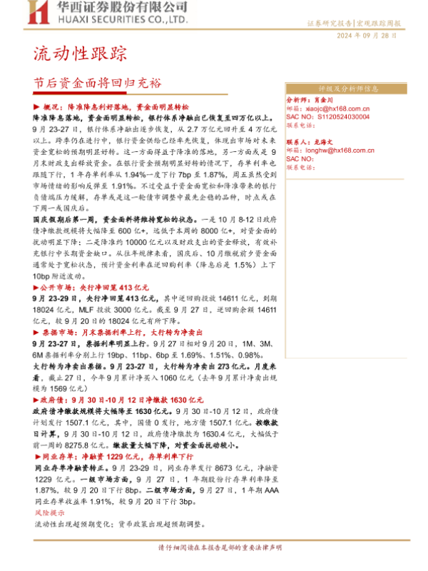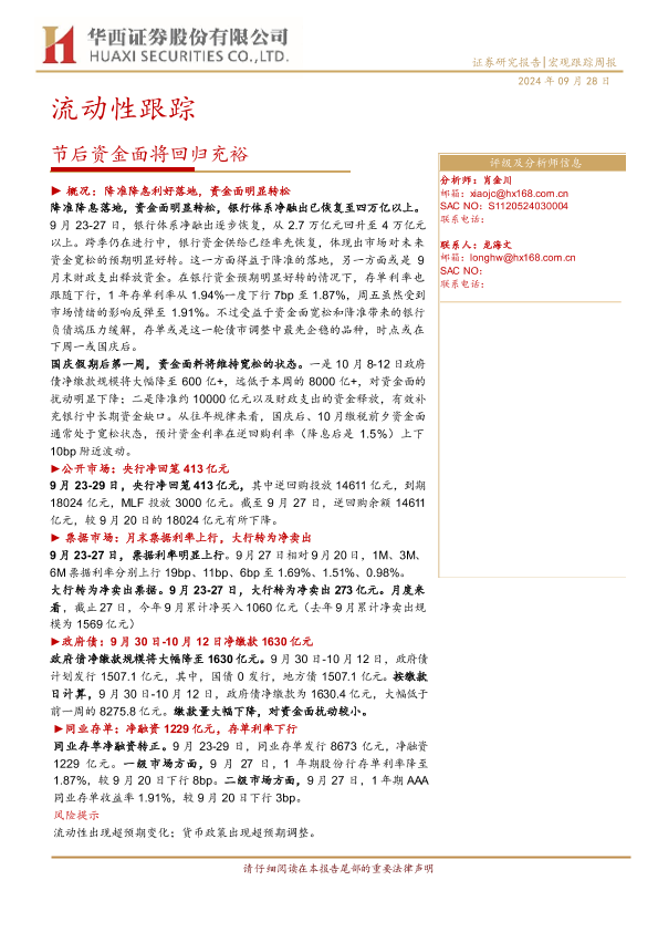 【华西证券】【20240928】流动性跟踪:节后资金面将回归充裕-20页