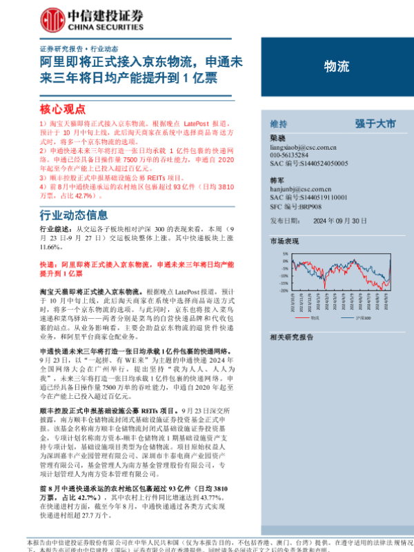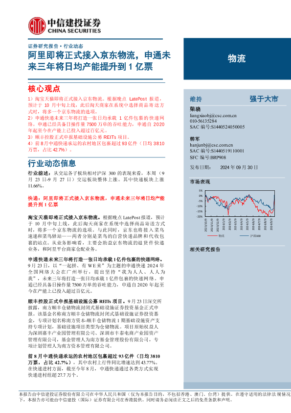 【中信建投证券】【20240930】物流行业:阿里即将正式接入京东物流,申通未来三年将日均产能提升到1亿票-17页