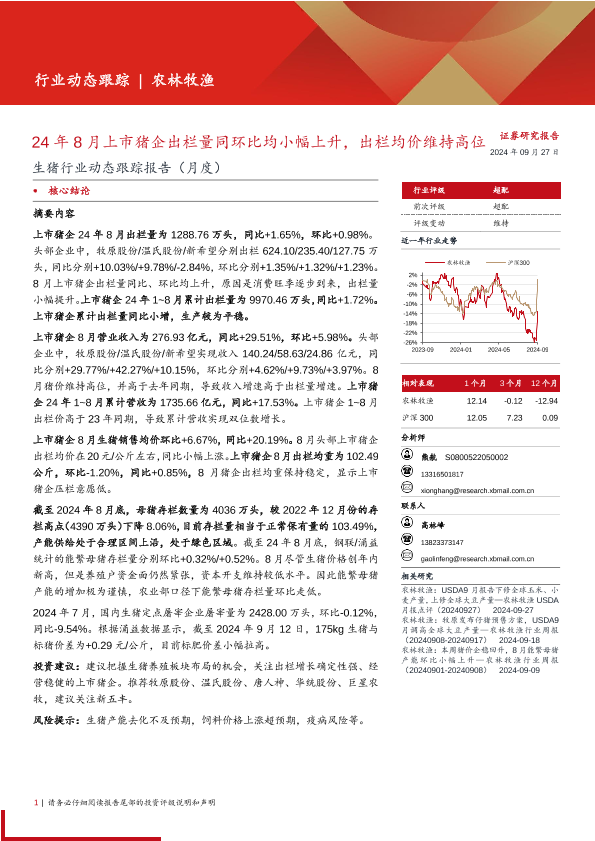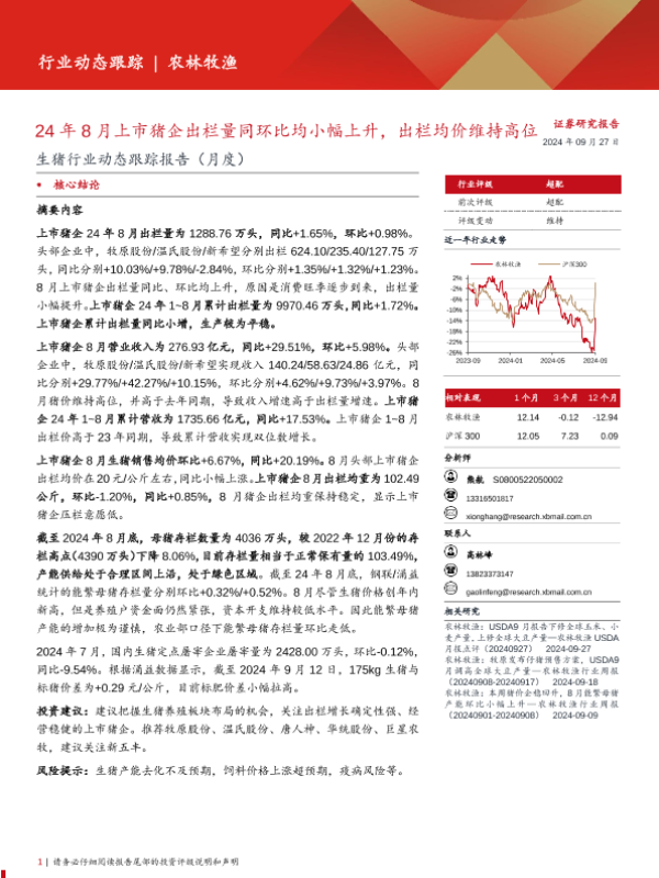 【西部证券】【20240927】生猪行业动态跟踪报告(月度):24年8月上市猪企出栏量同环比均小幅上升,出栏均价维持高位-15页
