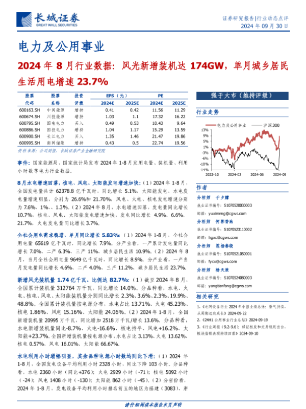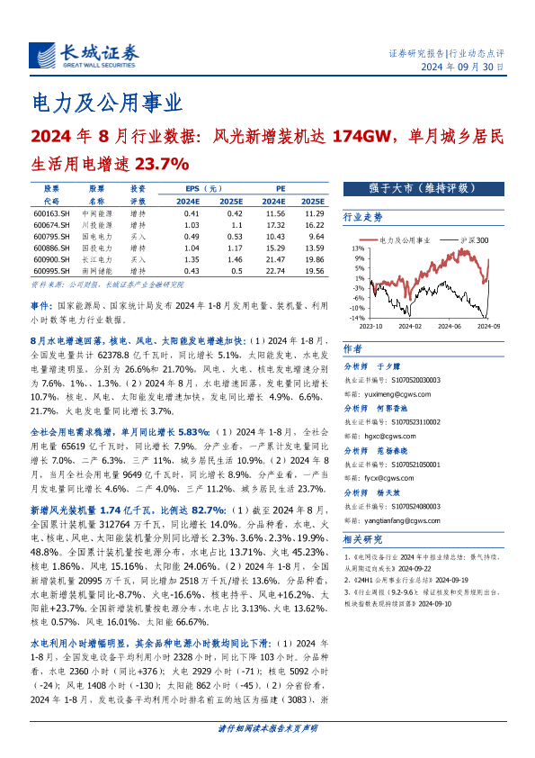 【长城证券】【20240930】电力及公用事业行业2024年8月行业数据:风光新增装机达174GW,单月城乡居民生活用电增速23.7%-12页