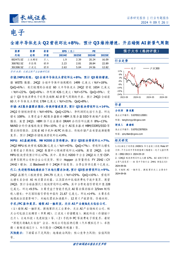 【长城证券】【20240926】电子行业:全球半导体龙头Q2营收环比+8%,预计Q3维持增速,开启端侧AI新景气周期-23页