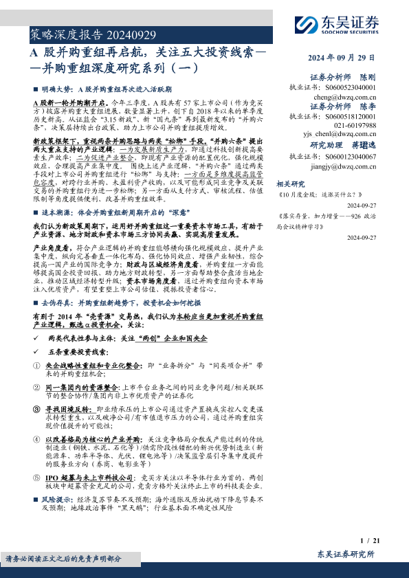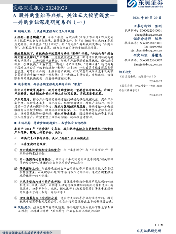 【东吴证券】【20240929】策略深度报告:并购重组深度研究系列(一),A股并购重组再启航,关注五大投资线索-21页