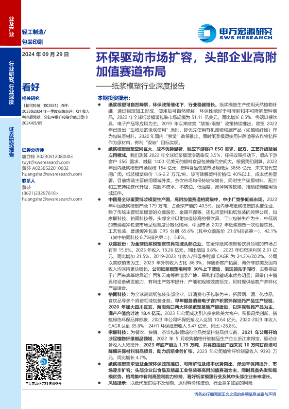 【申万宏源】【20240929】纸浆模塑行业深度报告:环保驱动市场扩容,头部企业高附加值赛道布局-26页