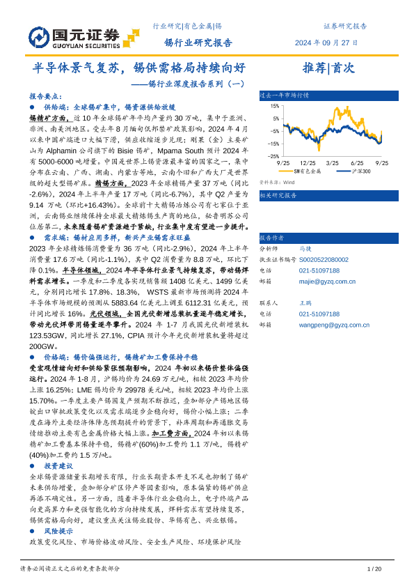 【国元证券】【20240927】锡行业深度报告系列(一):半导体景气复苏,锡供需格局持续向好-20页