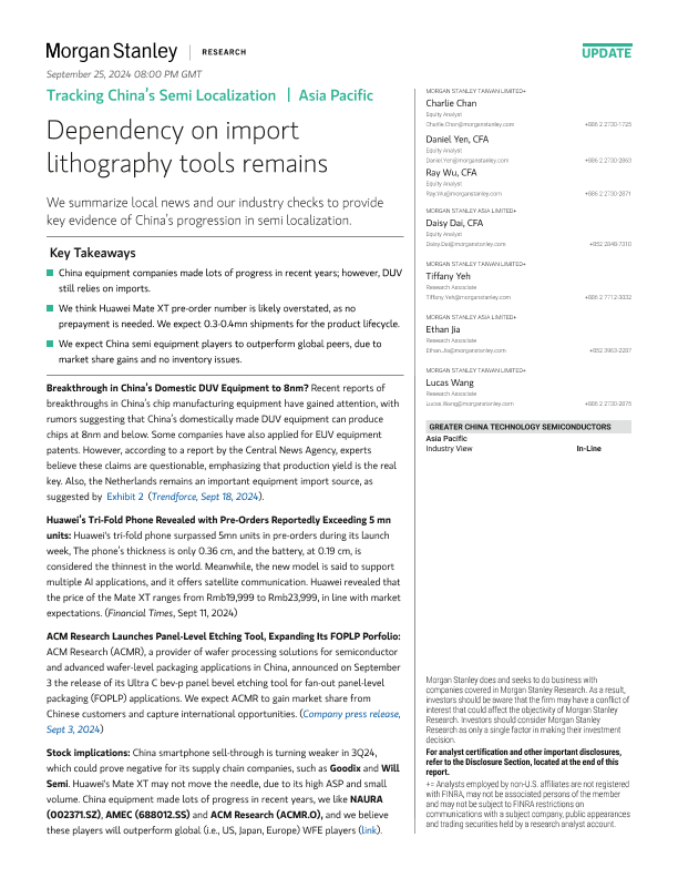 【Morgan Stanley】【2024】Tracking China’s Semi Localization Dependency on Import Lithography Tools-20页