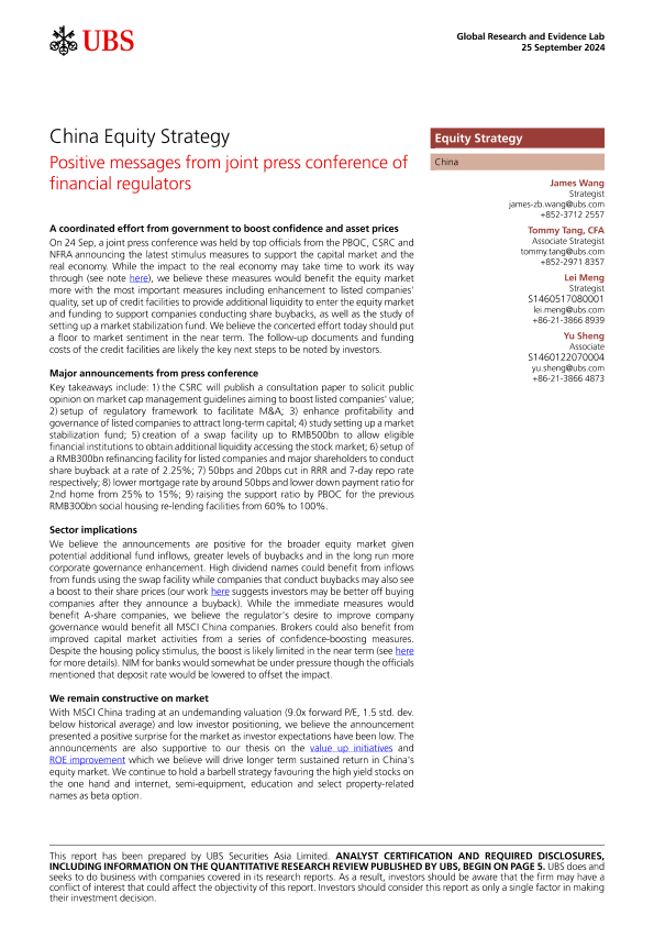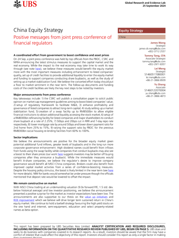 【UBS Securities Asia Limited】【20240925】es-China Equity Strategy _Positive messages from joint press conference of financial regulators-9页
