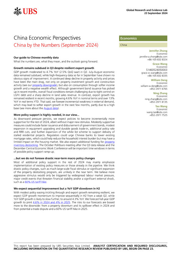 【UBS Securities Asia Limited】【20240923】China Economic Perspectives _China by the Numbers (September 2024)-26页