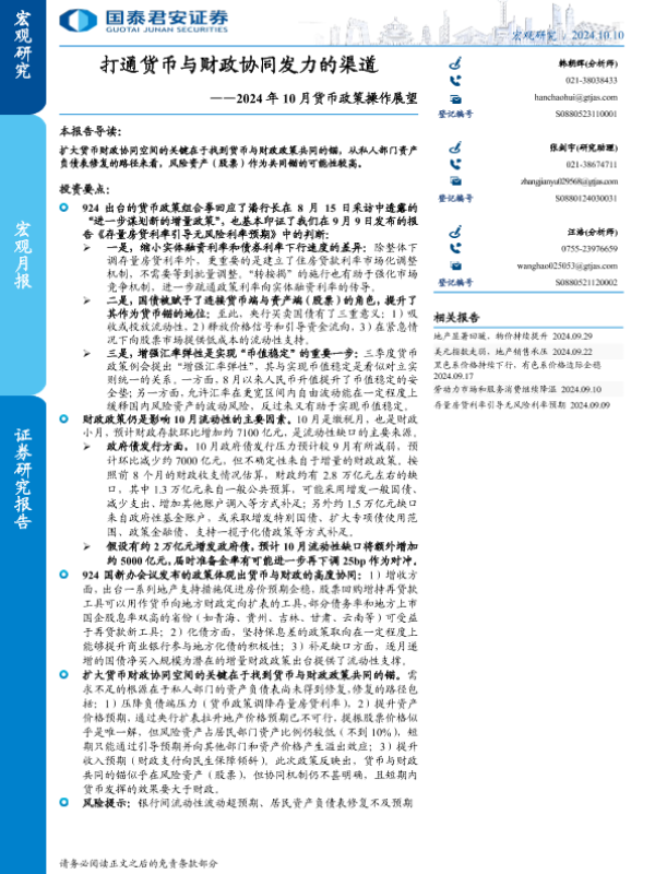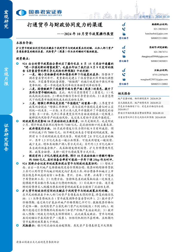 【国泰君安证券】【20241010】2024年10月货币政策操作展望:打通货币与财政协同发力的渠道-10页