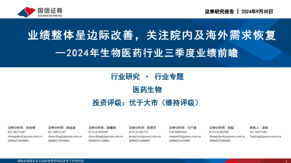 【国信证券】【20240930】2024年生物医药行业三季度业绩前瞻:业绩整体呈边际改善,关注院内及海外需求恢复-19页