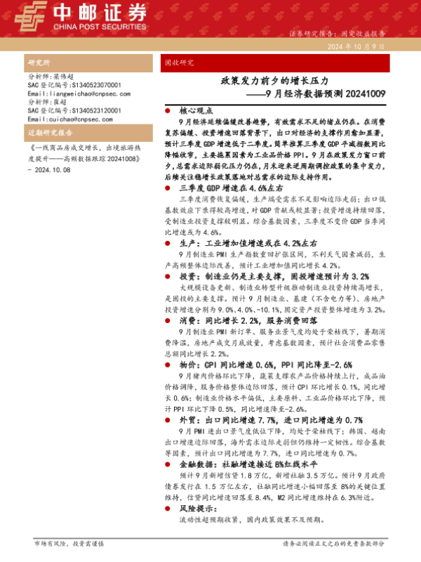 【中邮证券】【20241009】9月经济数据预测:政策发力前夕的增长压力-13页