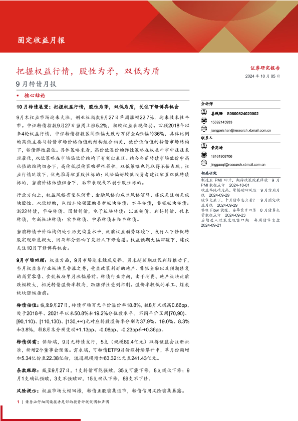 【西部证券】【20241005】9月转债月报:把握权益行情,股性为矛,双低为盾-17页