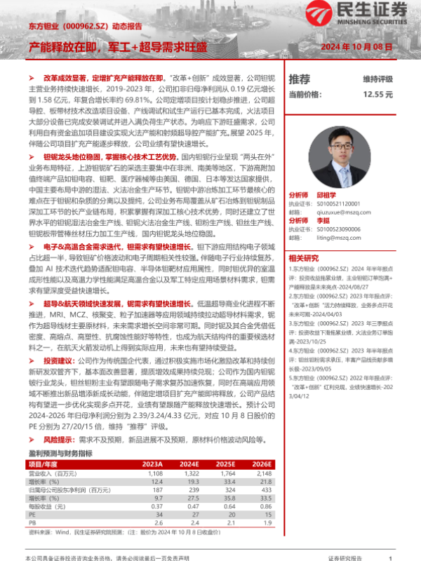 【民生证券】【20241008】东方钽业(000962)动态报告:产能释放在即,军工%2b超导需求旺盛-25页