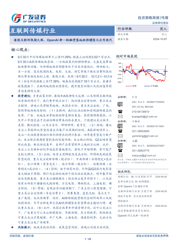 【广发证券】【20241007】互联网传媒行业:港股互联网假期大涨,OpenAI新一轮融资落地助推模型与应用迭代-23页