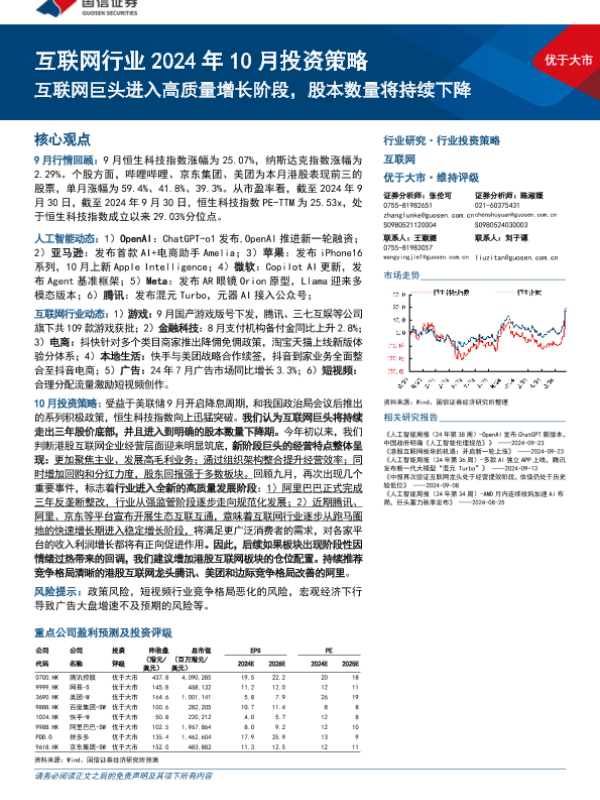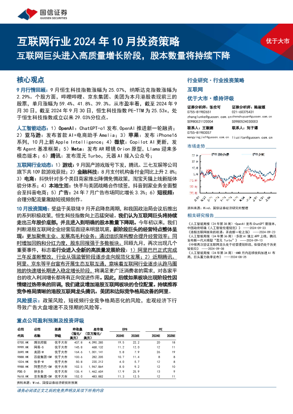 【国信证券】【20241003】互联网行业2024年10月投资策略:互联网巨头进入高质量增长阶段,股本数量将持续下降-19页