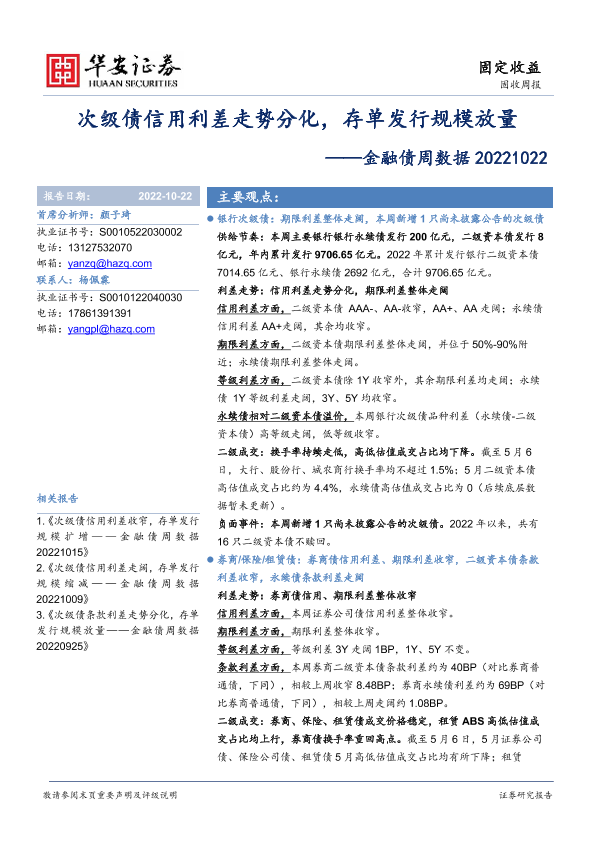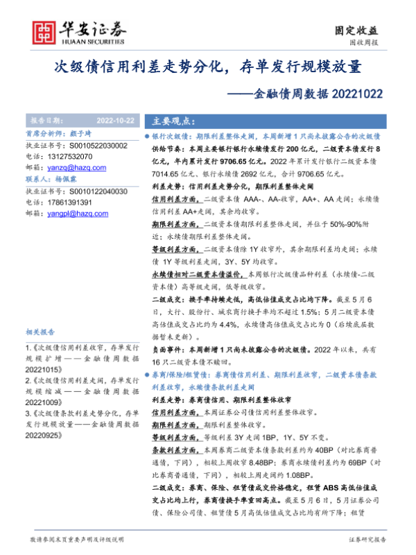 【华安证券】【20221022】金融债周数据:次级债信用利差走势分化,存单发行规模放量20221022-20页