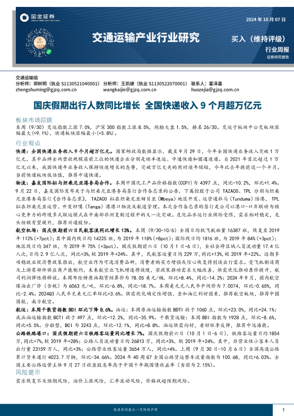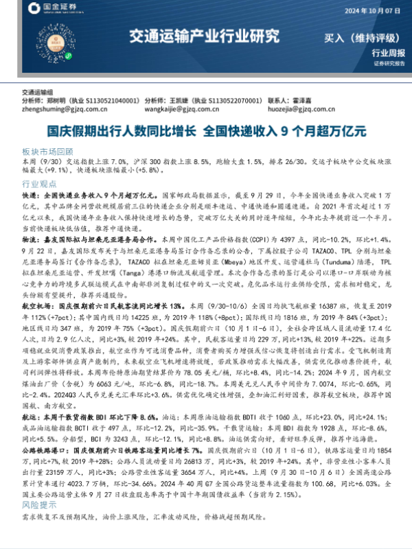 【国金证券】【20241007】交通运输产业行业研究:国庆假期出行人数同比增长,全国快递收入9个月超万亿元-14页