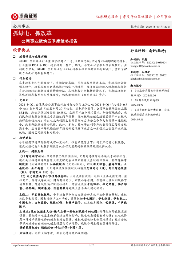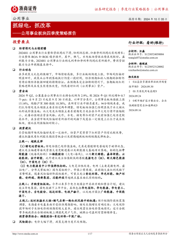 【浙商证券】【20241005】公用事业行业板块四季度策略报告:抓绿电,抓改革-17页