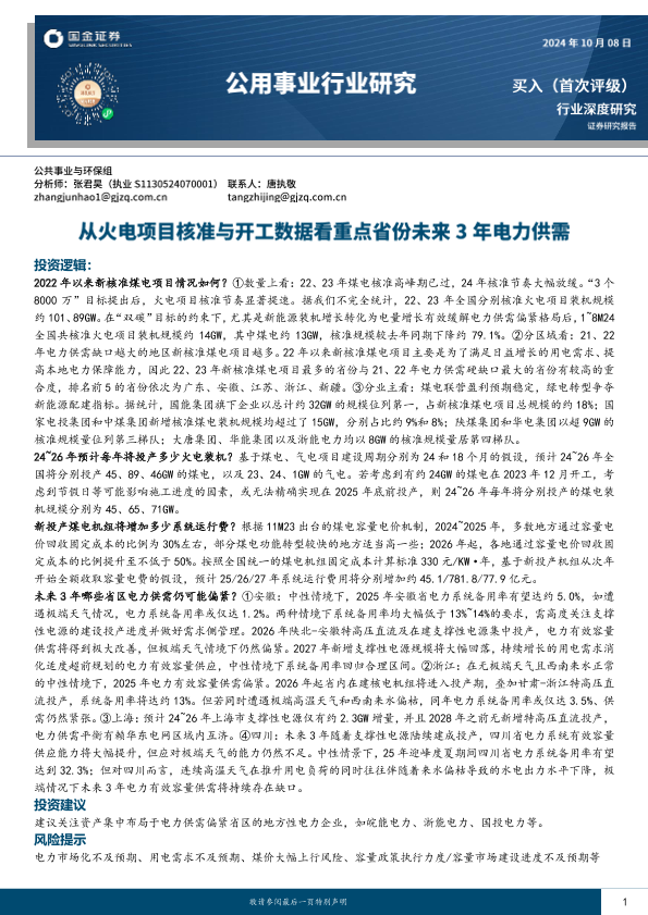 【国金证券】【20241008】公用事业行业研究:从火电项目核准与开工数据看重点省份未来3年电力供需-24页