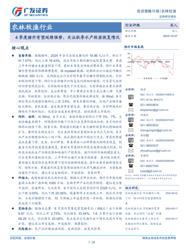 【广发证券】【20241007】农林牧渔行业:4季度猪价有望延续强势,关注秋季水产投苗恢复情况-24页