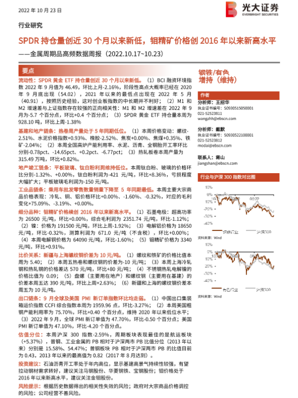 【光大证券】【20221023】钢铁有色行业金属周期品高频数据周报:SPDR持仓量创近30个月以来新低,钼精矿价格创2016年以来新高水平-26页