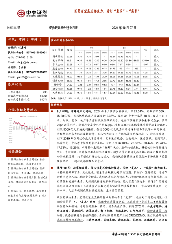 【中泰证券】【20241007】医药生物行业:医药有望成反弹主力,看好“复苏”+“成长”-16页