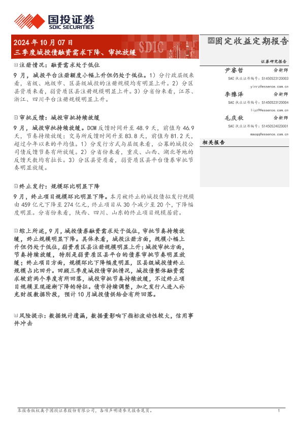 【国投证券】【20241007】固定收益定期报告:三季度城投债融资需求下降、审批放缓-11页