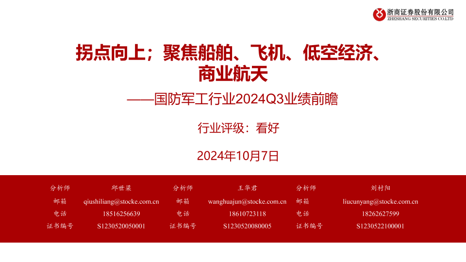 【浙商证券】【20241007】国防军工行业2024Q3业绩前瞻:拐点向上;聚焦船舶、飞机、低空经济、商业航天-22页