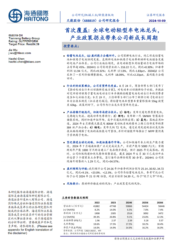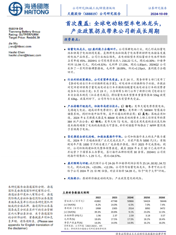 【海通国际】【20241009】天能股份(688819)首次覆盖:全球电动轻型车电池龙头,产业政策拐点带来公司新成长周期-12页