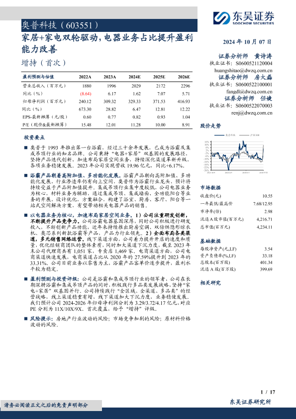 【东吴证券】【20241007】奥普科技(603551)家居+家电双轮驱动,电器业务占比提升盈利能力改善-17页