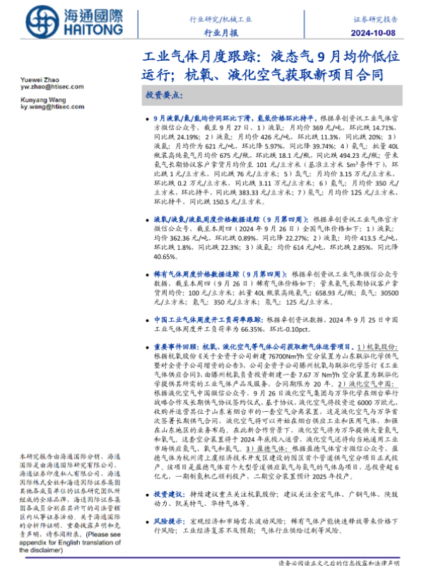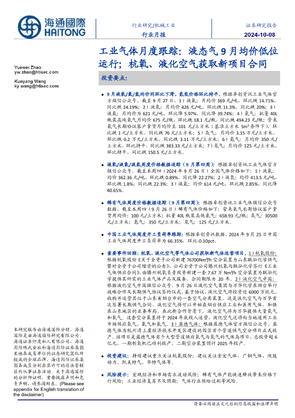 【海通国际】【20241008】工业气体月度跟踪:液态气9月均价低位运行;杭氧、液化空气获取新项目合同-11页