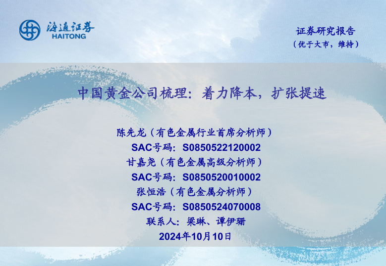 【海通证券】【20241010】有色金属行业中国黄金公司梳理:着力降本,扩张提速-29页