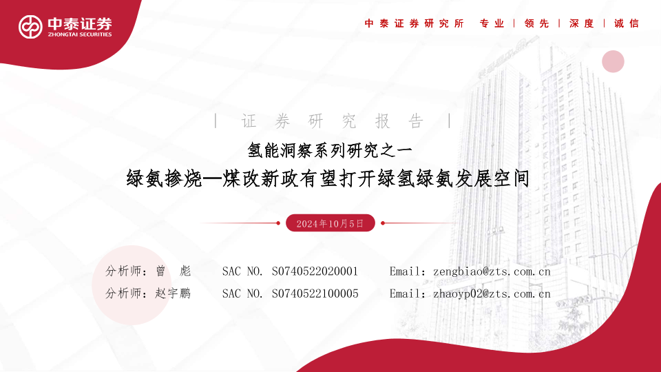 【中泰证券】【20241005】氢能行业洞察系列研究之一:绿氨掺烧—煤改新政有望打开绿氢绿氨发展空间-30页
