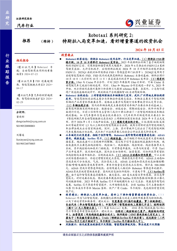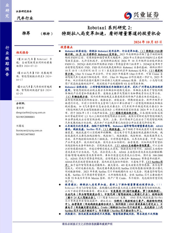 【兴业证券】【20241003】汽车行业Robotaxi系列研究2:特斯拉入局变革加速,看好增量赛道的投资机会-12页